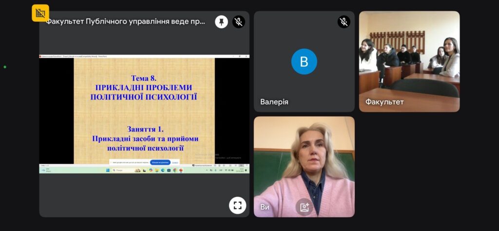 29 жовтня 2025 року в. о завідувача кафедри політології та філософії, к. соц. наук, доцент Тетяна Грубі провела гостьову лекцію із навчальної дисципліни «Політична психологія» для студентів ІІ курсу спеціальності 053 Психологія Хмельницького університету управління та права імені Леоніда Юзькова. Лекція була присвячена аналізу психологічних факторів, що визначають характер сучасної політичної боротьби та особливостей впливу психологічних технологій на масову свідомість.